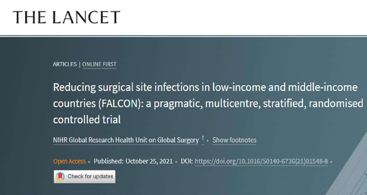 Reducing surgical site infections in low-income and middle-income countries (FALCON): a pragmatic, multicentre, stratified, randomised controlled trial. 2021. NIHR Global Research Health Unit on Global Surgery. DOI: https://doi.org/10.1016/S0140-6736(21)01548-8